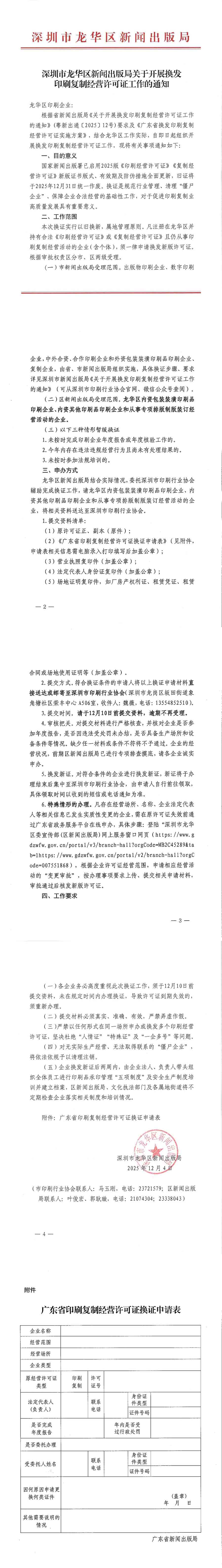 深圳市龙华区新闻出版局关于开展换发印刷复制经营许可证工作的通知