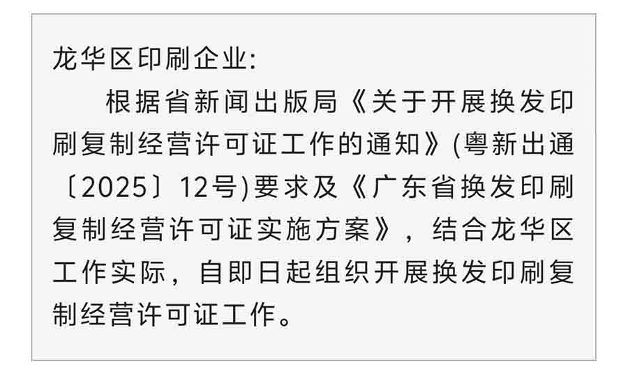 深圳市龙华区新闻出版局关于开展换发印刷复制经营许可证工作的通知